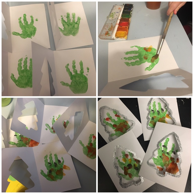 Открытки сделали для бабушек и папы. Ванины отпечатки ладошек превратили в наряженные ёлочки.