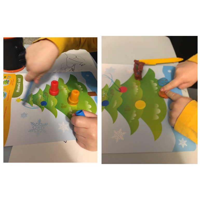 Потом Ваня нарисовал штампами игрушки на ёлку и слепил подарки