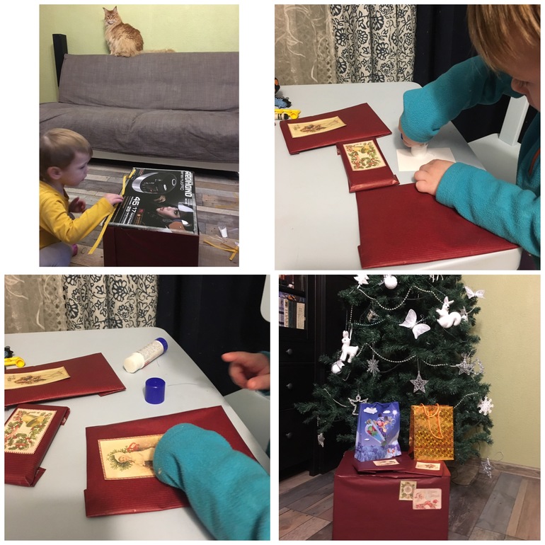 Упаковываем и украшаем подарки. Заворачивали в бумагу и приклеивали картинки.