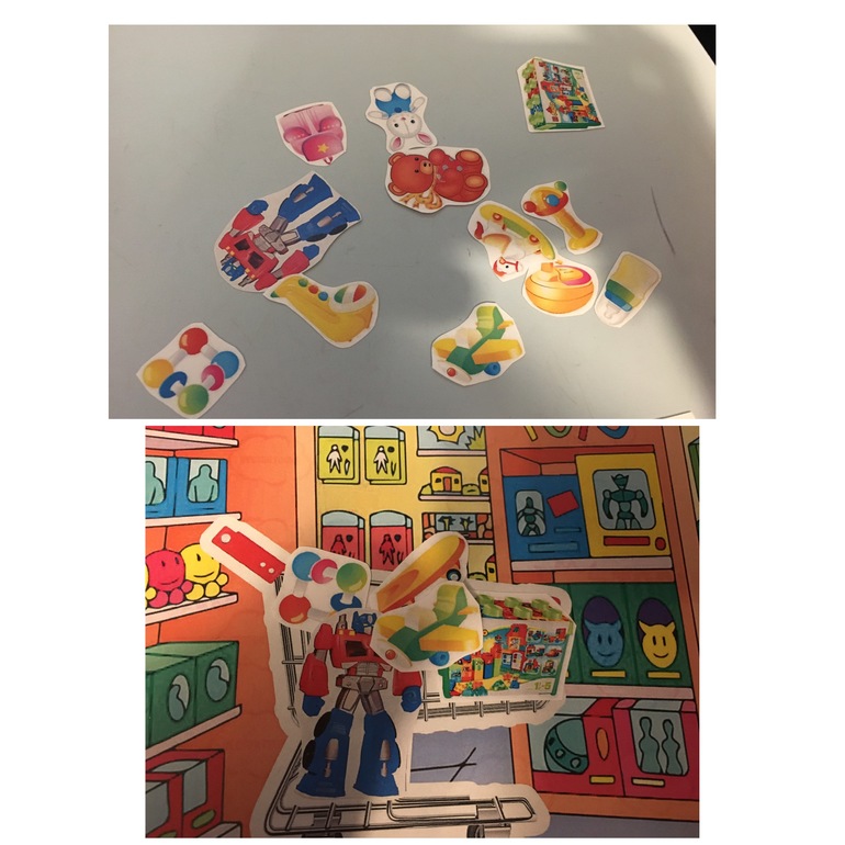 Сделали аппликацию «В магазине». Нужно было выбрать и наклеить подарки в тележку. Было интересно, что же Ваня выберет.