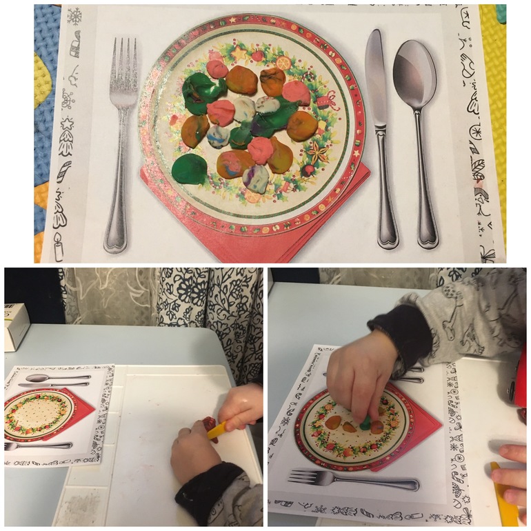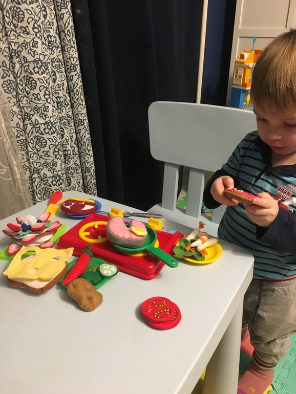 Целый день играли в кухню. Лепим «оливье»: резали колбасу, добавляли горошек)))