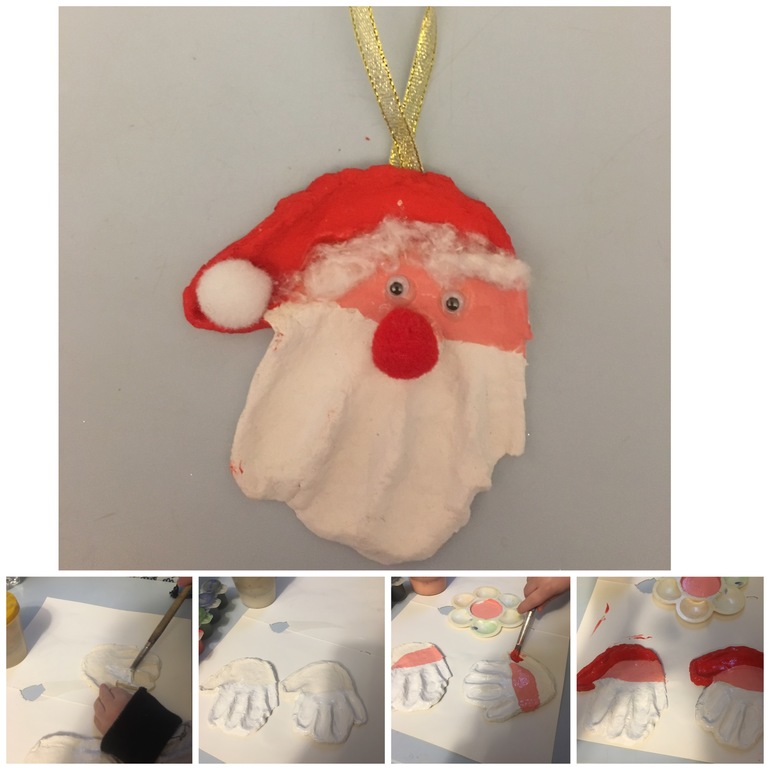 Отпечатки ладошек на соленом тесте высохли, поэтому мы их раскрасили и украсили. Это будут ёлочные игрушки для бабушек.