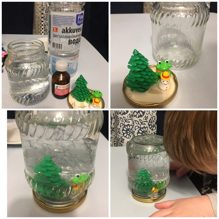 Подарок для папы - снежный шар. Слелали мы его из банки, маленьких игрушек. Нарезали мишуру, добавили бусинок, налили воды и добавили глицерин.