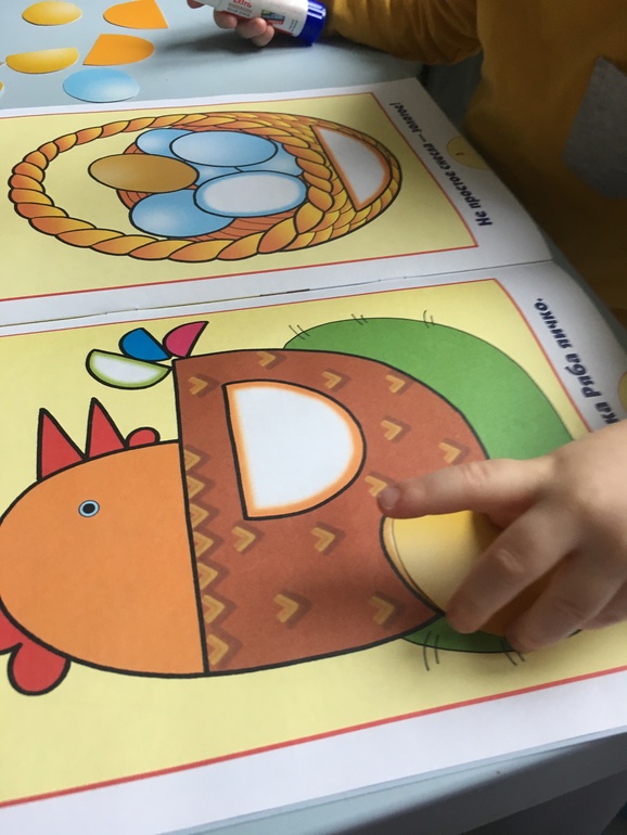В Ш7Г есть книга про формы в виде сказки «Курочка Ряба». Читаем и наклеиваем предметы овальной формы