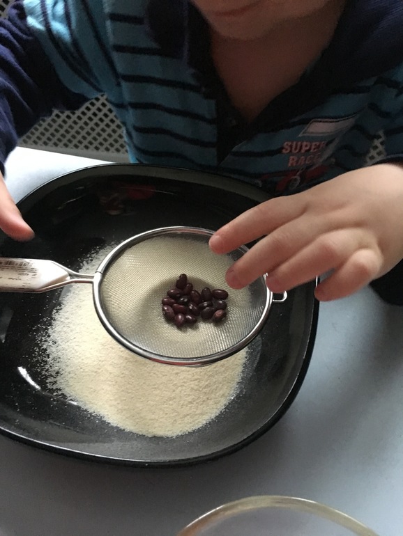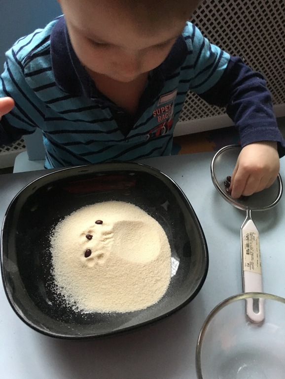 Потом отсеивали фасолины из манки с помощью сита. Проделали 4 раза подряд и всегда удивление: как так это происходит?)))