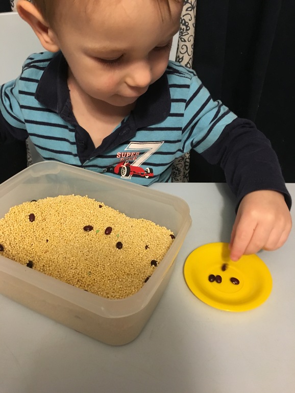 Следующее задание найти фасолины в пшене, чтобы накормить курочку. Оооо это самое любимое задание, ребенок занят минут на 30))) С крупами очень любит играть.