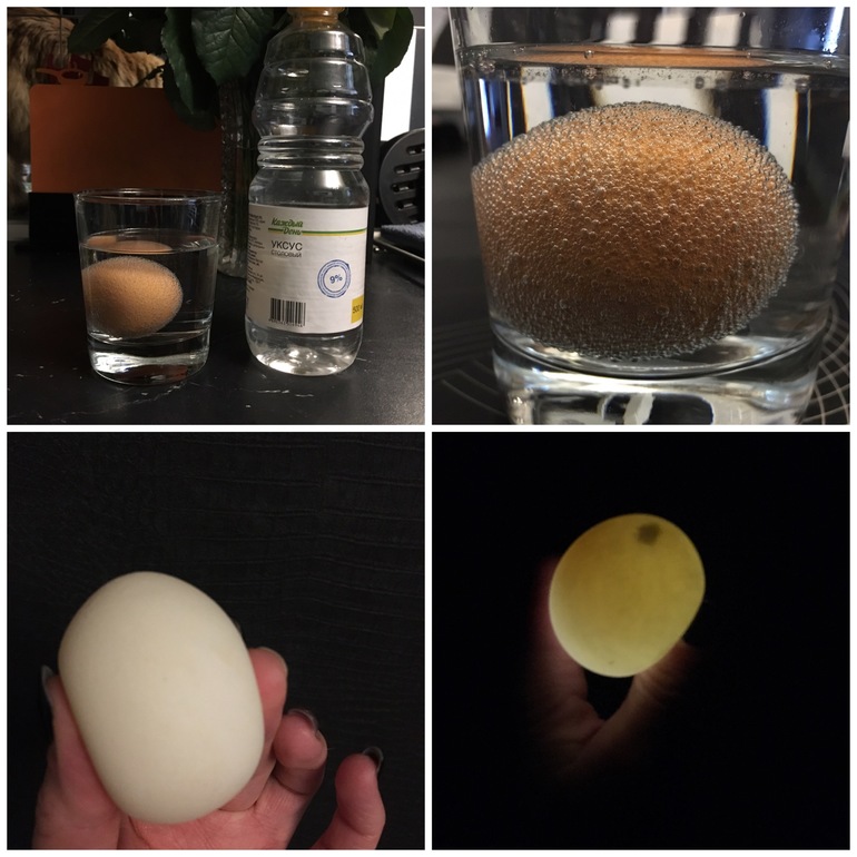 Яйцо стало мягкое, как резиновое, а если в темноте подсветить фонариком, то светится неоновым светом.