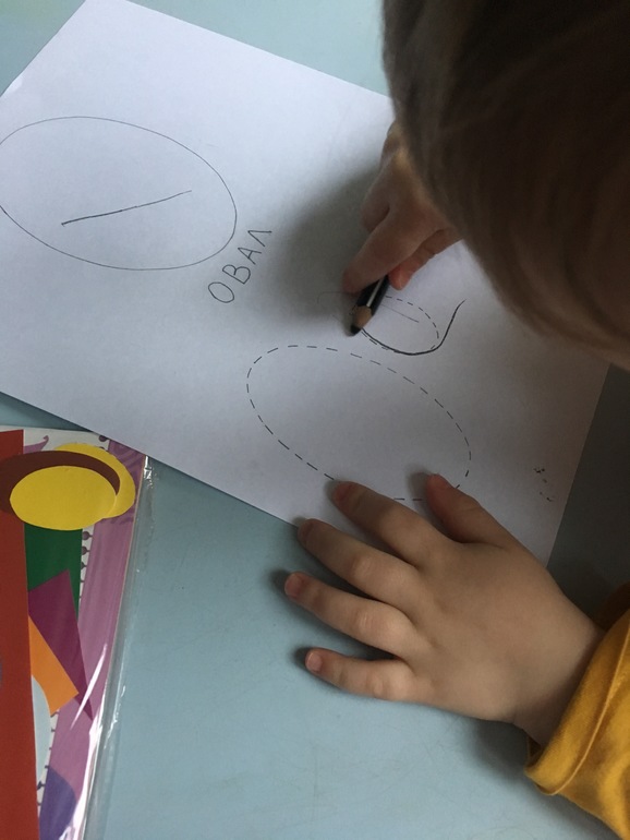 Показываю лист с изображением овала. Называем фигуру. Обводим пальчиком.
