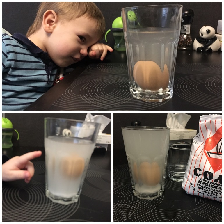 1. Подводная лодка. Опускаем сырое яйцо в воду - оно тонет. Насыпаю 3 ложки волшебного порошка (соли) - яйцо всплывает. Доливаю воды - тонет. Ооочень понравился опыт.