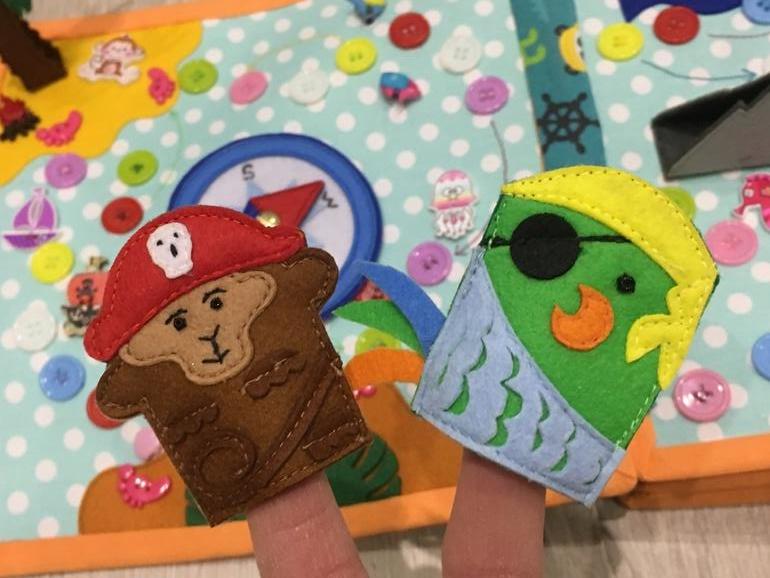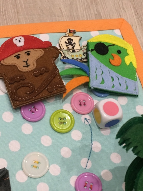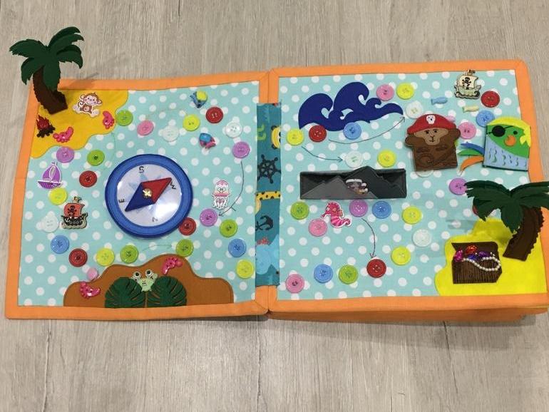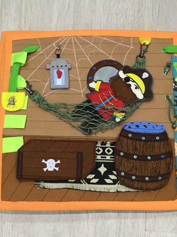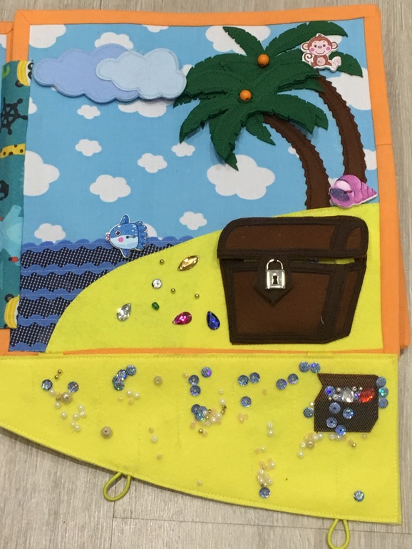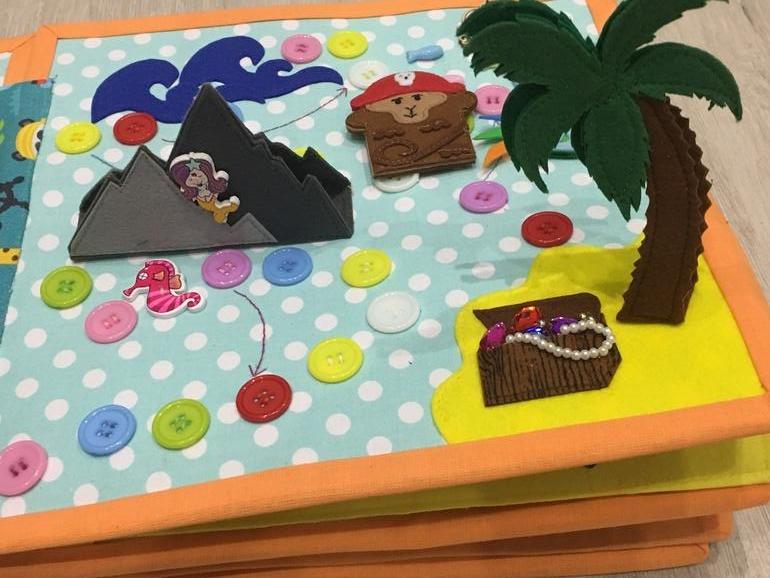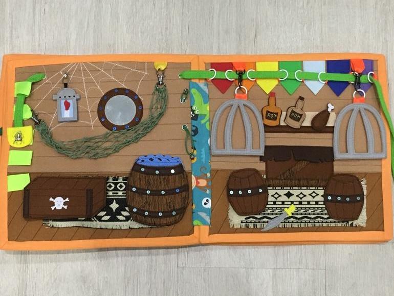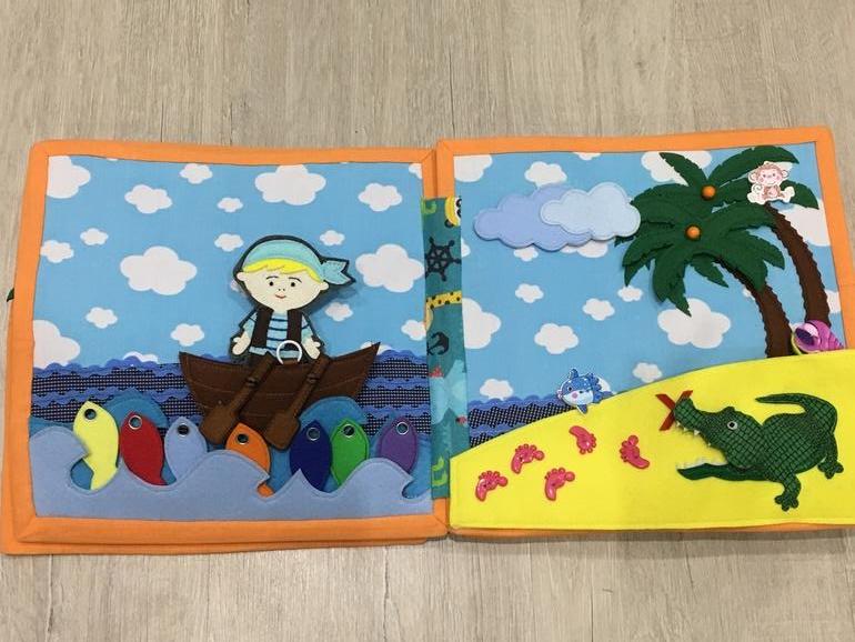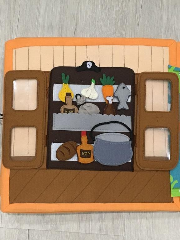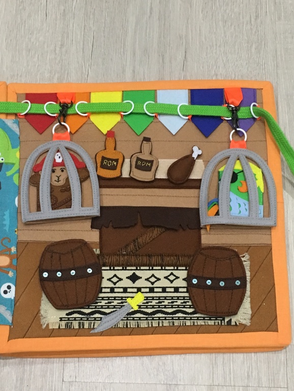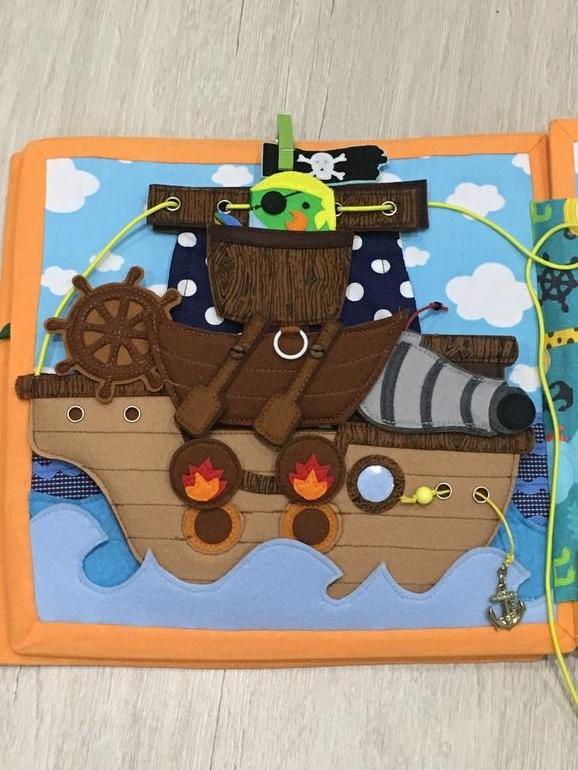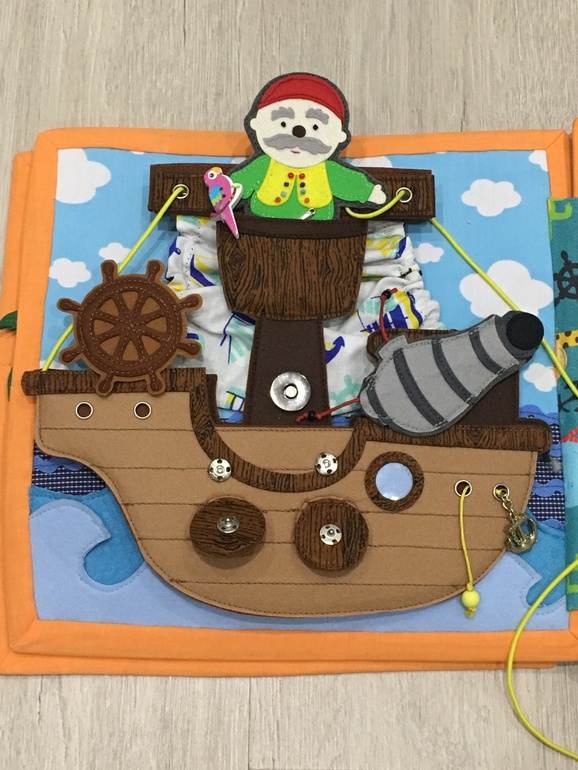 В книге много съемных элементов, три героя, пиратский корабль, остров с сокровищами, различные игры и другие интересности. Не забываем и про развивающую функцию: шнуровки, пуговки, перетяжки, липучки, лабиринты, крючки, кнопки, различные крепления - все что нужно для тренеровки детских пальчиков. Далее подробно. Много фото.