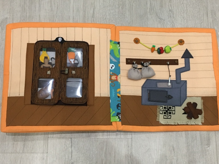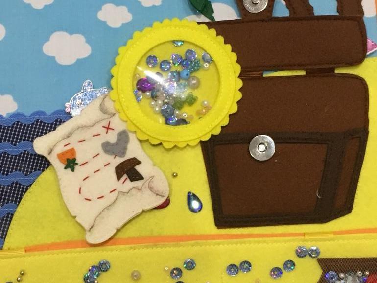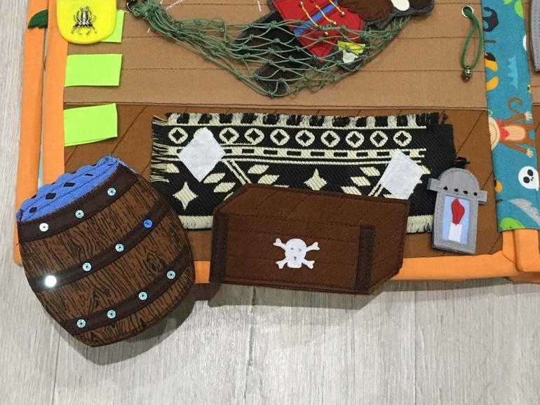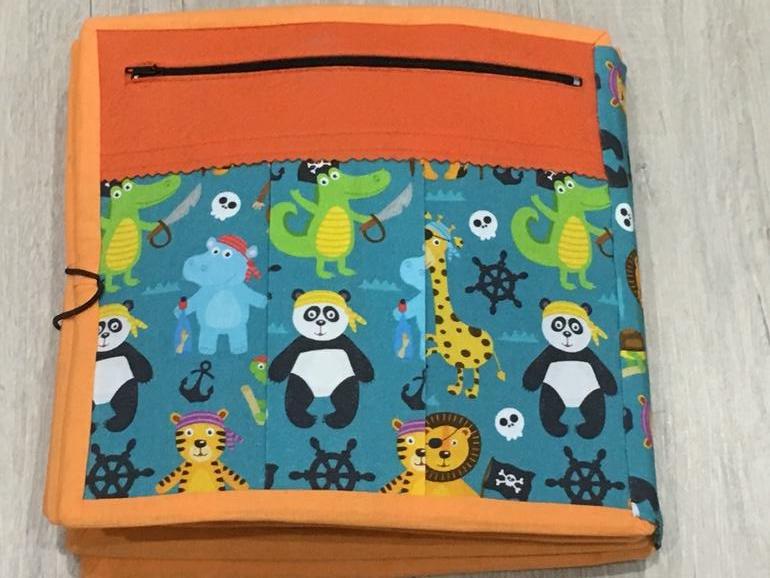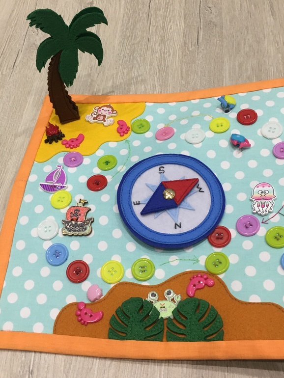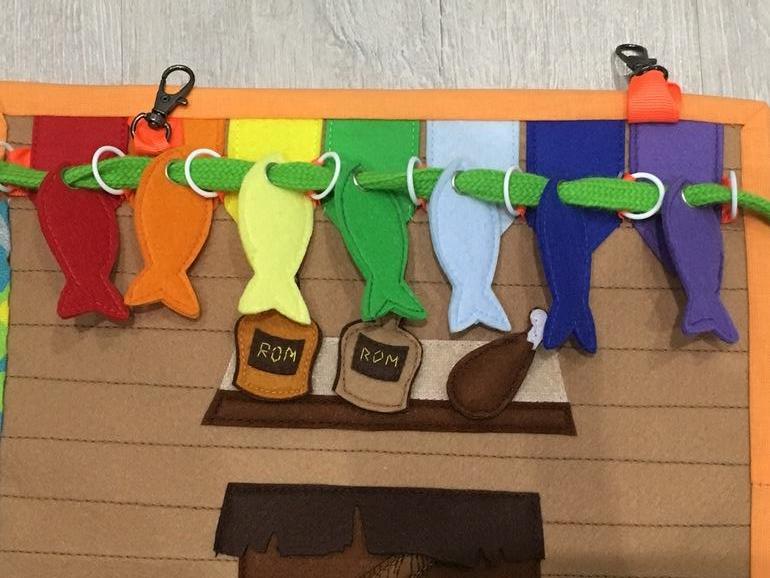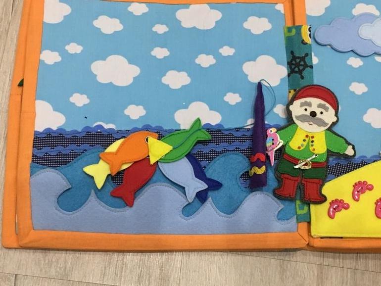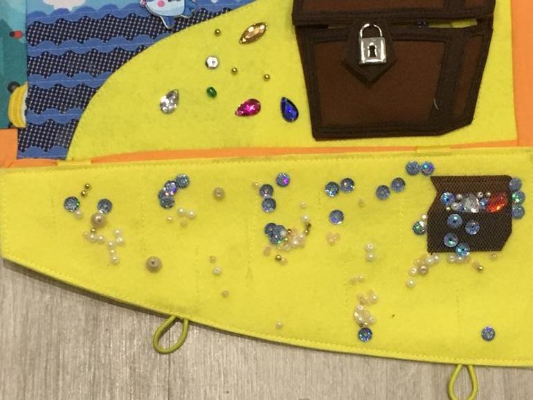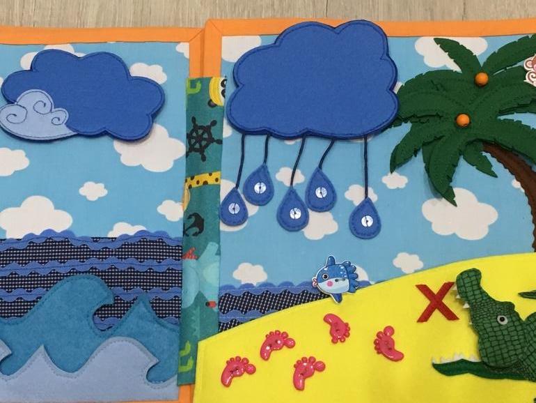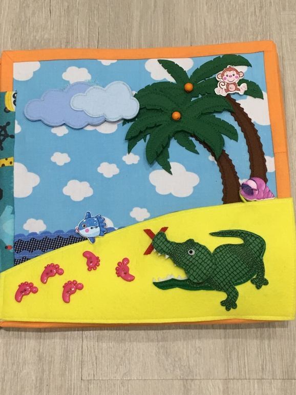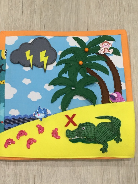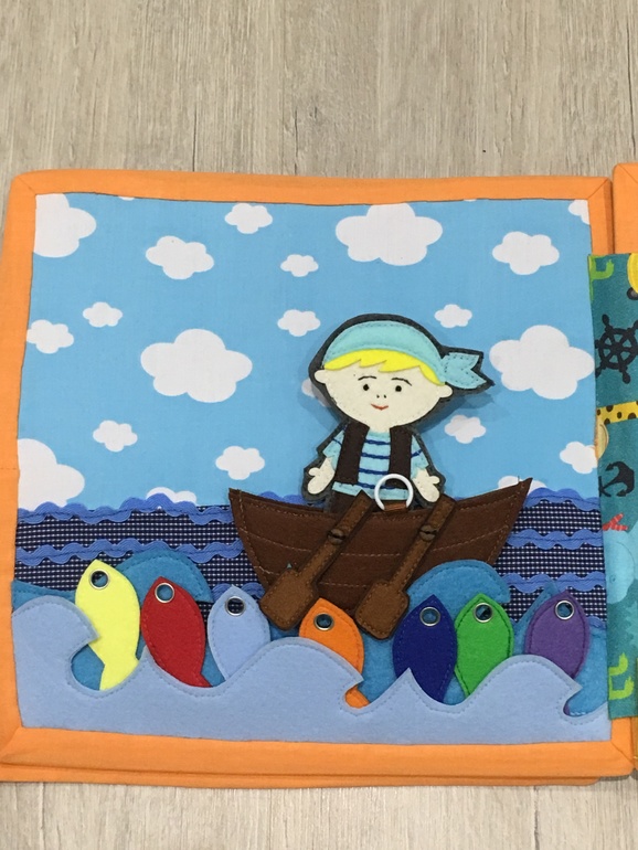 В книге много съемных элементов, три героя, пиратский корабль, остров с сокровищами, различные игры и другие интересности. Не забываем и про развивающую функцию: шнуровки, пуговки, перетяжки, липучки, лабиринты, крючки, кнопки, различные крепления - все что нужно для тренеровки детских пальчиков. Далее подробно. Много фото.