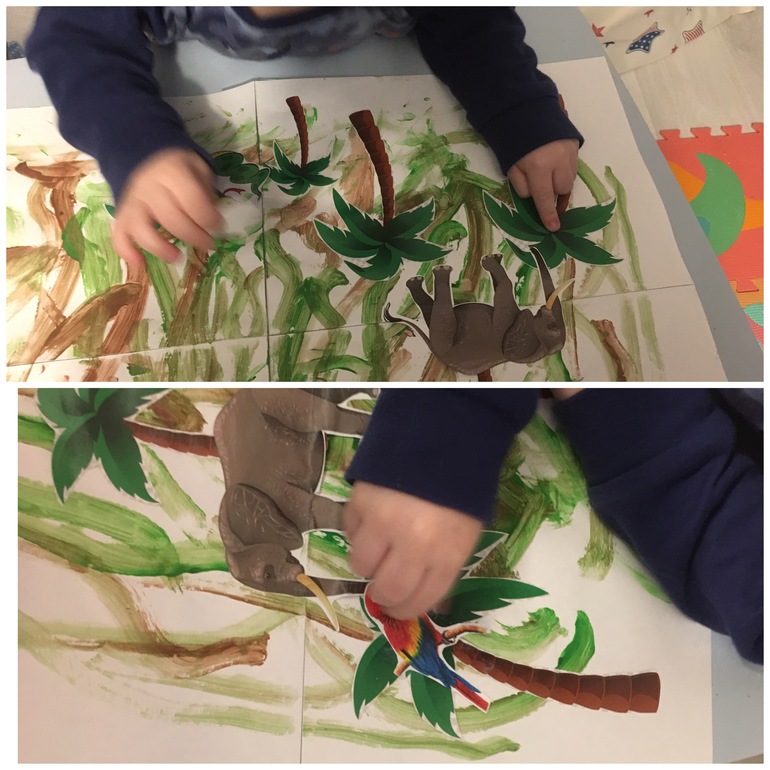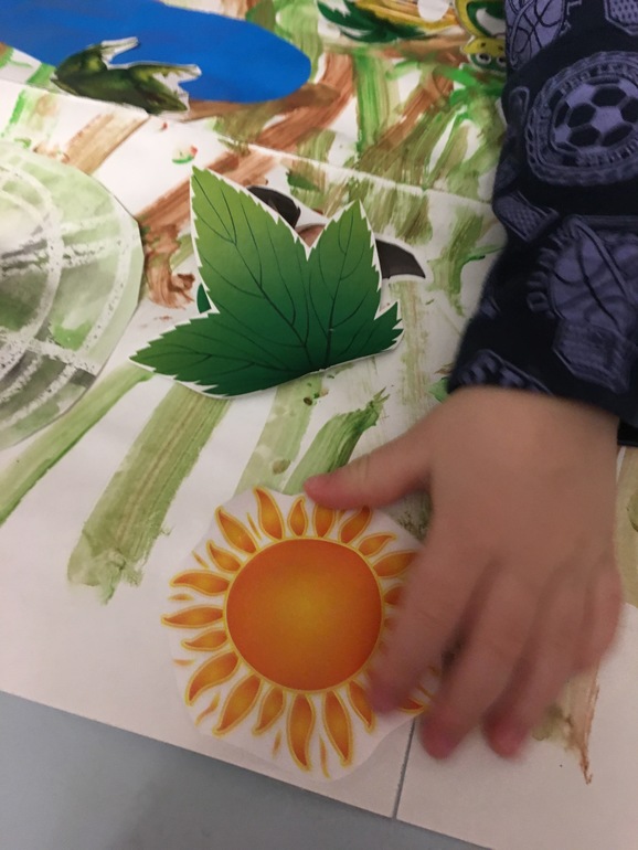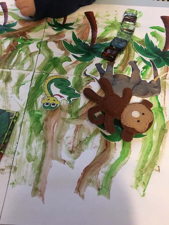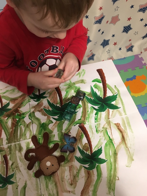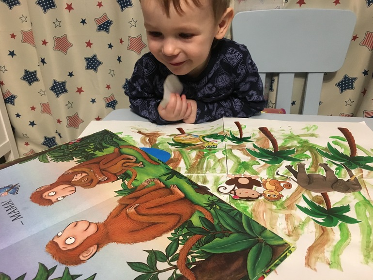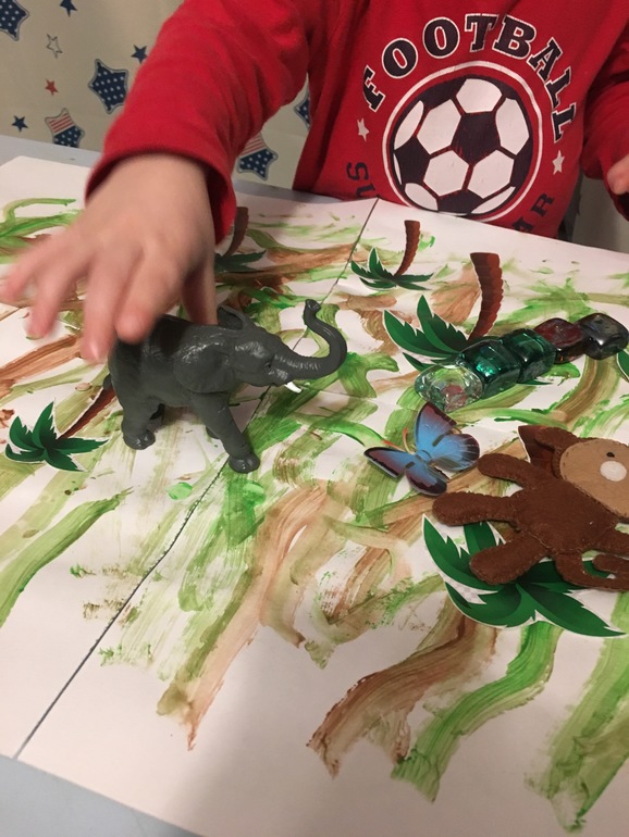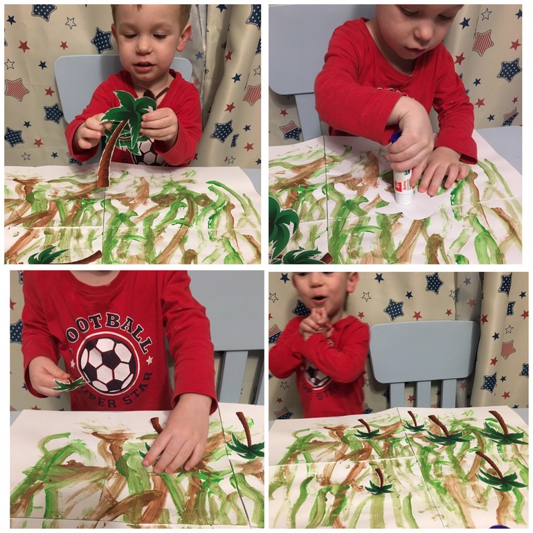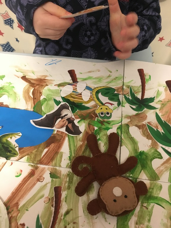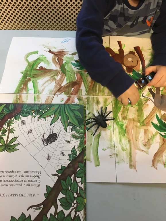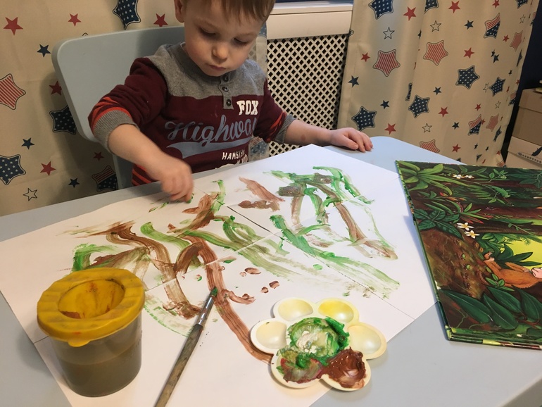 Потом я предлагаю Ване нарисовать джунгли, как в книге. Взяли большой лист бумаги (я склеила 4 листа А4). Как красить - даю свободу фантазии Вани. Рисовал пальцами, руками, кистью