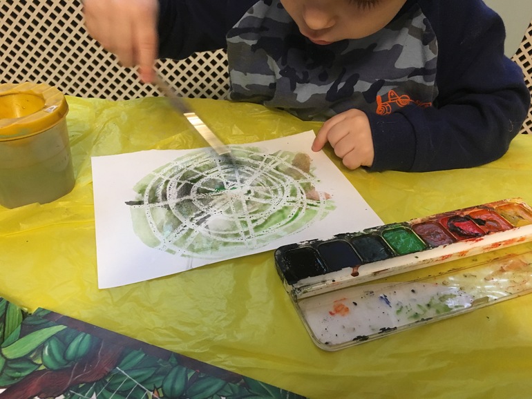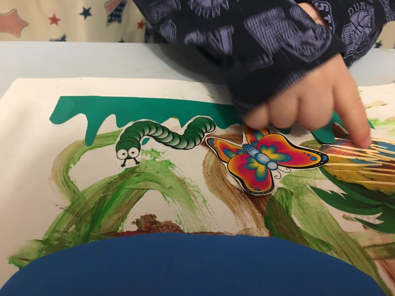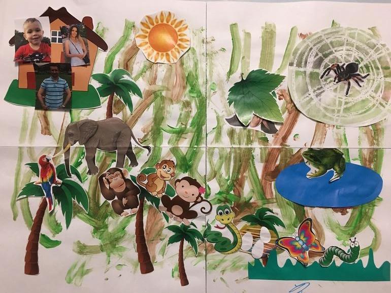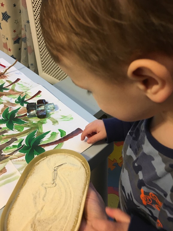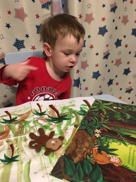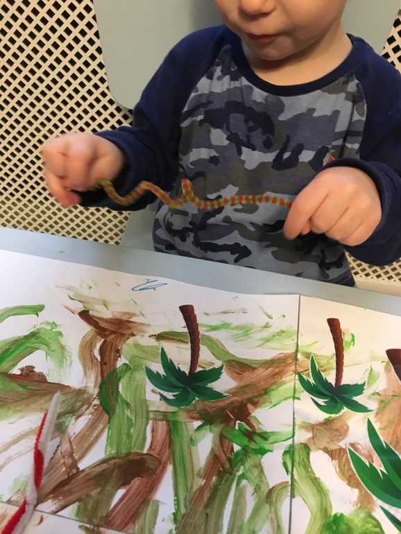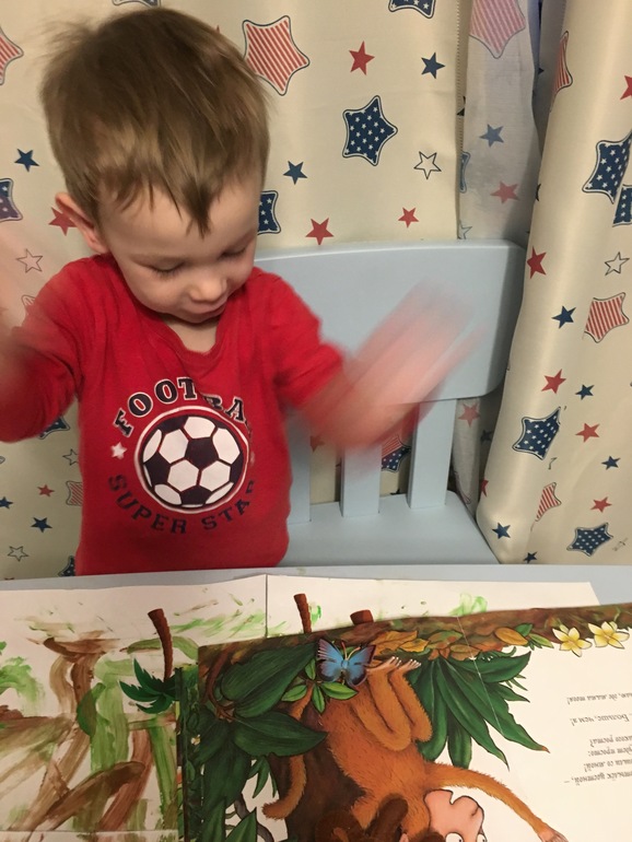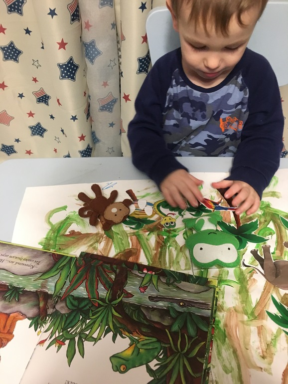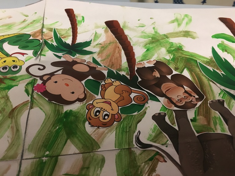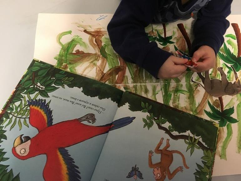 Потом я предлагаю Ване нарисовать джунгли, как в книге. Взяли большой лист бумаги (я склеила 4 листа А4). Как красить - даю свободу фантазии Вани. Рисовал пальцами, руками, кистью