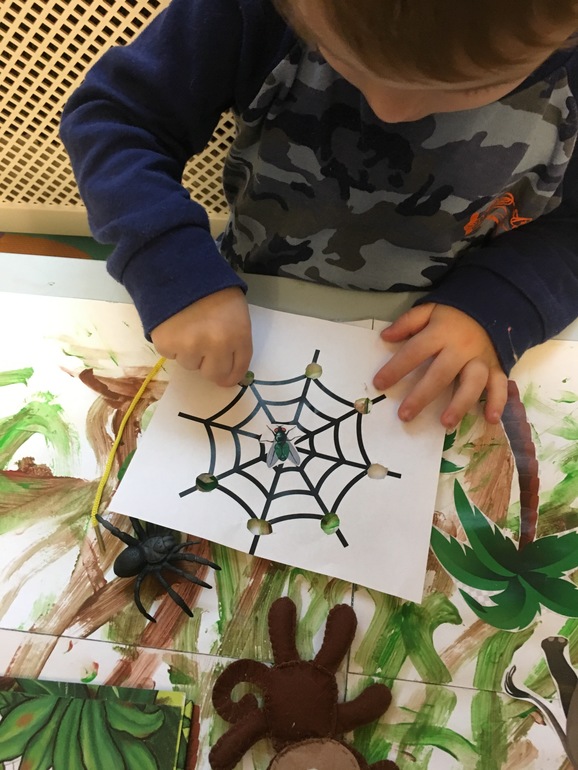 Паук плетет паутину. И мы тоже решили сплести - шнуровка. Распечатала рисунок паутины, проделала дырочки, с помощью шнурка от покупных шнуровок «плетем» паутину