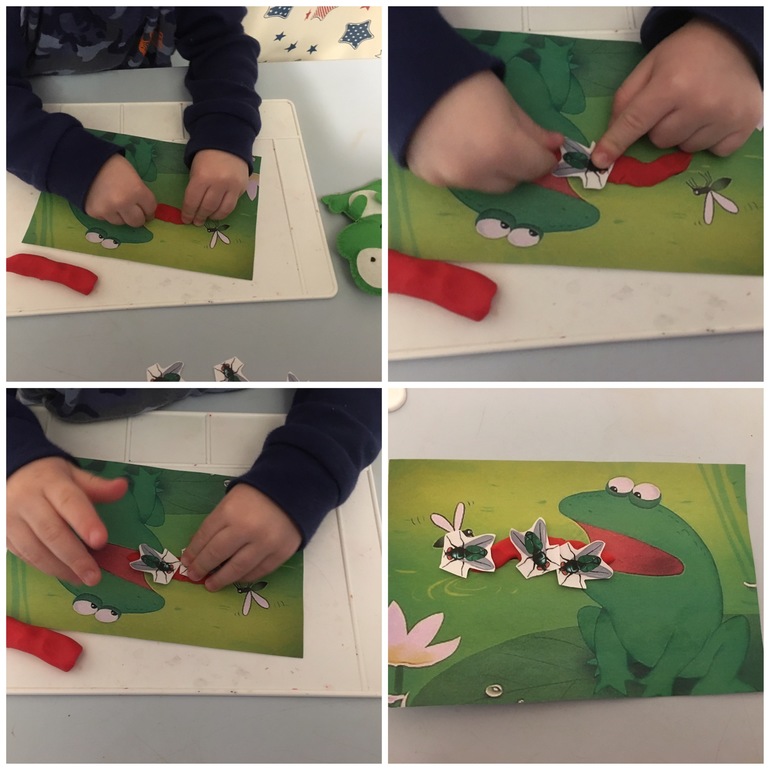 На картинку прикрепили из пластилина язык лягушке и прилепили к нему мух.