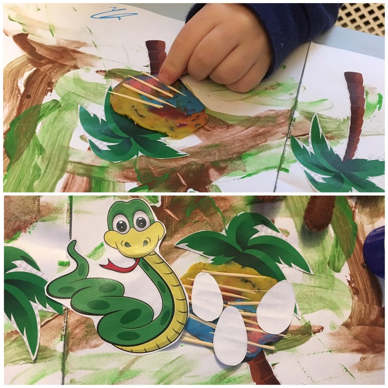 Делаем гнездо змеи из пластилина и зубочисток. Змеи откладывают яйца как птицы. Приклеиваем змею и яйца. Считаем яйца.
