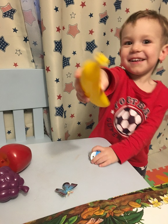 Что любят есть обезьянки? Бананы! Задание: определить наощупь игрушечный банан среди других фруктов (накрываю платочком). Определаем с первой попытки