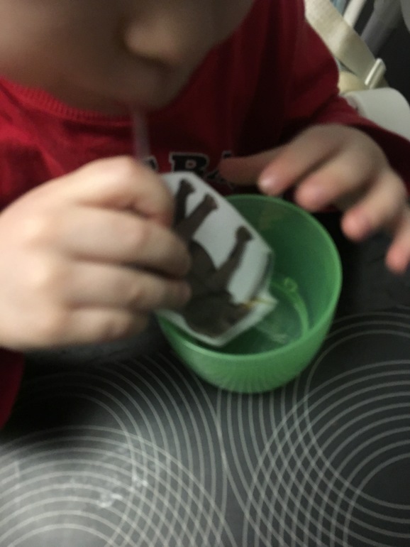 Показываю, как змея ползает. На крышку высыпала манку, сверху положила «змею» (из металлических скрепок), а снизу магнитом заставляла ее ползать. Восторг!!! Смотрим, какой след оставляет змея. А Ваня просил «ещё! ещё!» и ловил)