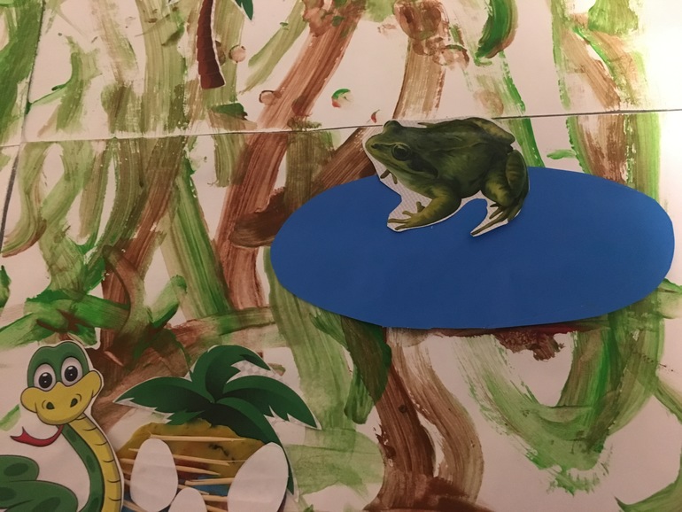 Рассматриваем, слушаем запись кваканья. А где живет лягушка? В воде. А у нас нет водоема. Приклеиваем болото. Селим лягушку.