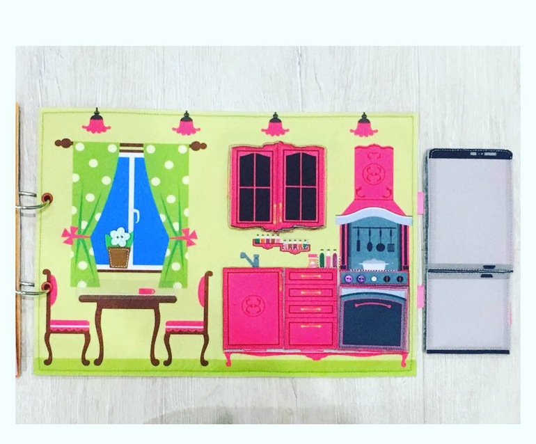6. Кухня. В холодильнике много разных продуктов. Еду можно приготовить на плите или в духовке, в шкафчиках посуда и продукты для малыша.