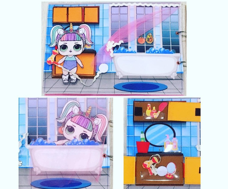 5. Ванная комната. Куколки могут принять ванну с пеной. Шторка раскрывается. В шкафчиках много аксессуаров, фен подключается к розетке (кнопка).