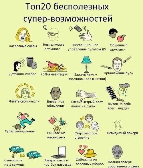 Помните, году в 95-ом по ОРТ показывали сериал "Карин и ее собака". Вот после него мне очень хотелось уметь читать мысли. Но потом я повзрослела и поняла, что не хочу читать мысли, хочу оставаться в счастливом неведении. 8 рук и возможность управлять ими автономно - вот что бы мне пригодилось, особенно с тремя детьми