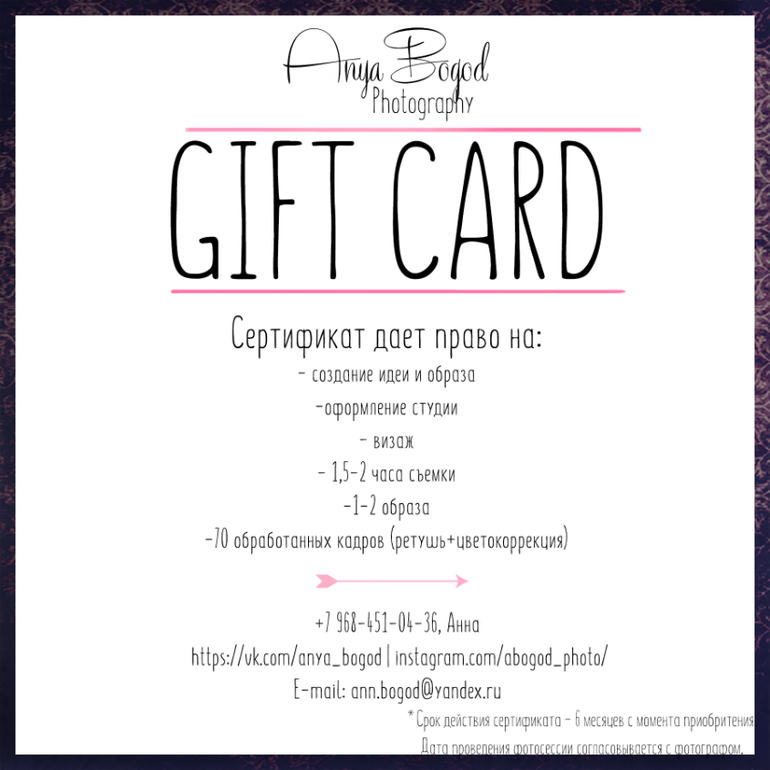 Теперь фотосессию можно подарить в виде подарочной карты в красиво оформленном конверте. Дизайн для каждого сертификата индивидуальный!