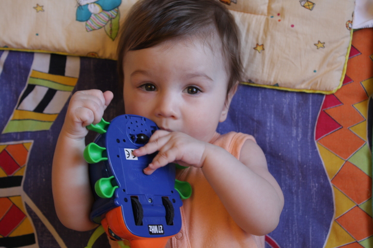 -указывает пальчиком, может брать двумя пальчиками что-то легкое и небольшое (например пуговицы на игрушке или собачку на молнии), нажимает на клавиши пианино , любит кидаться игрушками, отлично плавает с кругом ( как лягушка ).