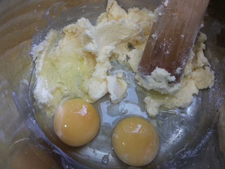 Растереть. Добавить 2 яйца и 2 ст.л. мёда: