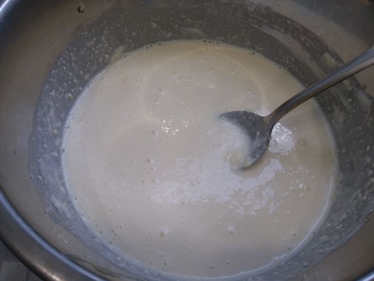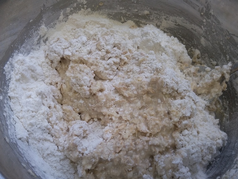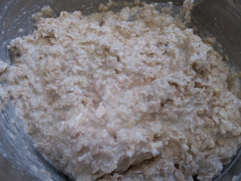 Дать набухнуть 5-10 минут. Затем добавить 1 стакан муки с 1 ч.л. разрыхлителя: