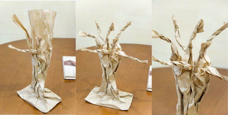 На днища крафт-пакета приклеиваем картон. Потом формируем ствол дерева - сминаем пакет. Верхнюю часть пакета разрезаем на части - ветви, тоже их скручиваем. Все это мы с Настей вместе проделывали. Просто сложно фотографировать этот процесс, потому что она всегда против.