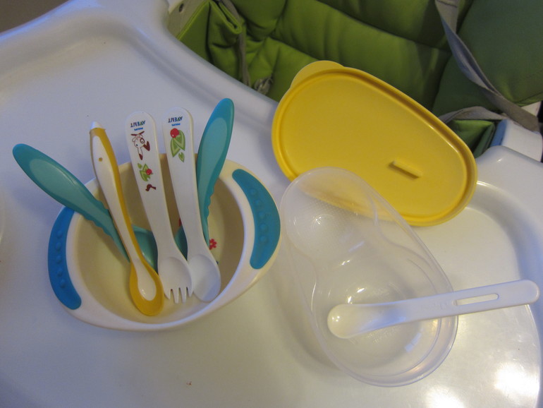 Тарелочка глубокая ПоМа, Б\У мало. Ложка и вилка АВЕНТ(вилкой не пользовались совсем, ложка Б/У). Тарелочка, я называю "дорожная", с крышкой и ложкой, внутри на дне меньшего отделения "пупырки" для протирания, удобно брать с собой например отварные овощи. Новая, вскрыли упаковку и помыли, но не пригодилась.