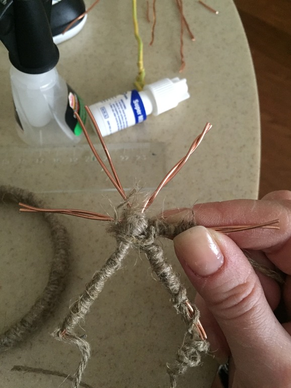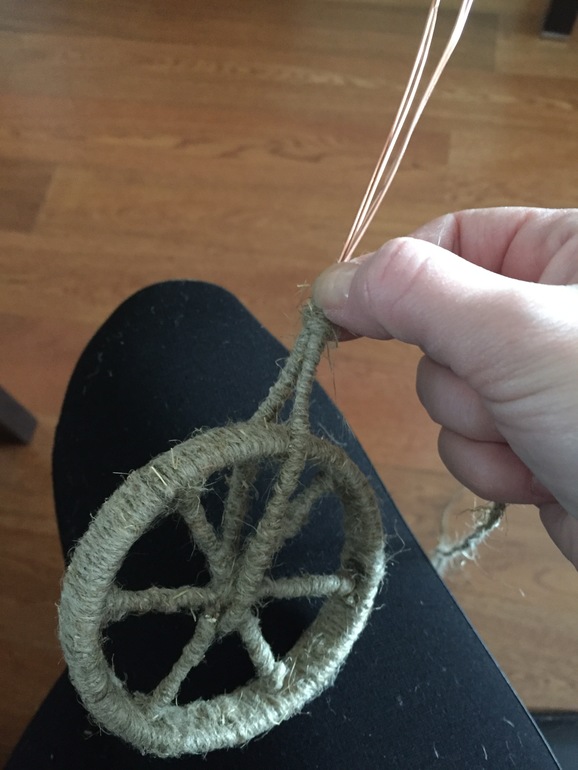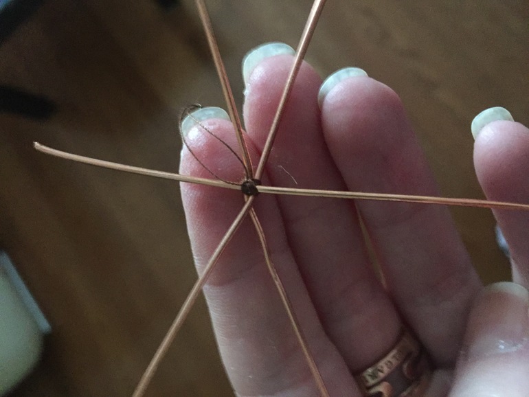 2. Делаем спицы для колеса! 3 проволоки я зафиксировала обычными швейными нитками,что бы они не распадались, при обматывании самих спиц. Сами спицы внутри колеса ничем не зафиксированы, просто отрезала проволоку четко по внутреннему диаметру колеса. Держатся крепко!