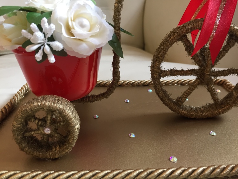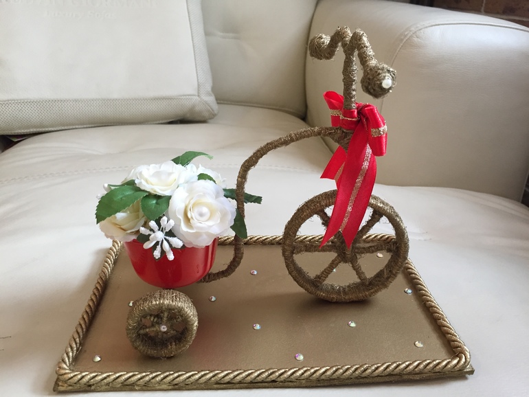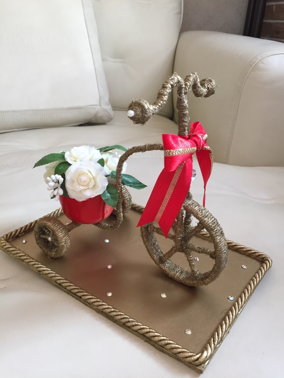 Материалы: Картонная основа от скотча (на что он намотан) для переднего колеса, картонная основа от фольги (на что она намотана) для задних колес, нитки купленные в строительном магазине, проволока,супер клей, кусок ДВП для подставки, крышка от йогурта для вазы), краска автомобильная красная и эмаль золото (в баллончиках), клеевой пистолет, небольшой кусок пенопласта для фиксации цветов в горшке, цветы искусственные, но и для украшения стразы, полубусины и атласная лента для бантика). Не затратно совсем, а получается очень прикольно) Всегда не стыдно кому-то подарить или просто поставить дома на полку для декора)