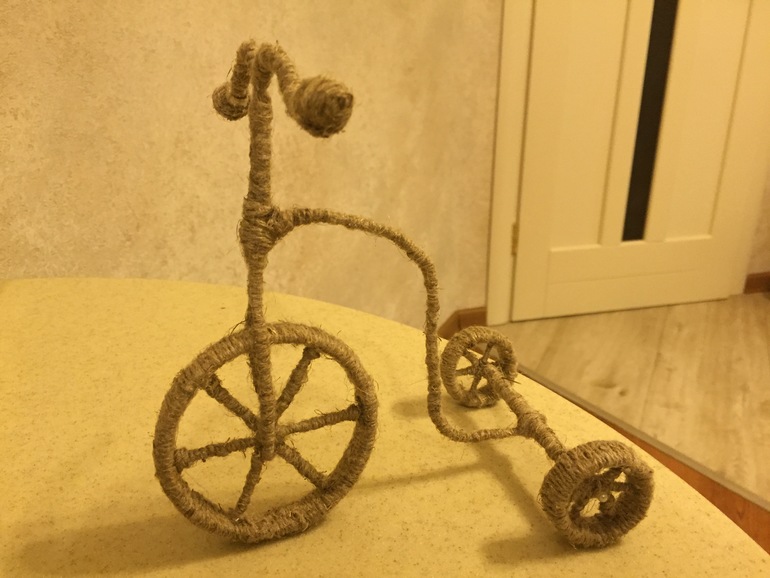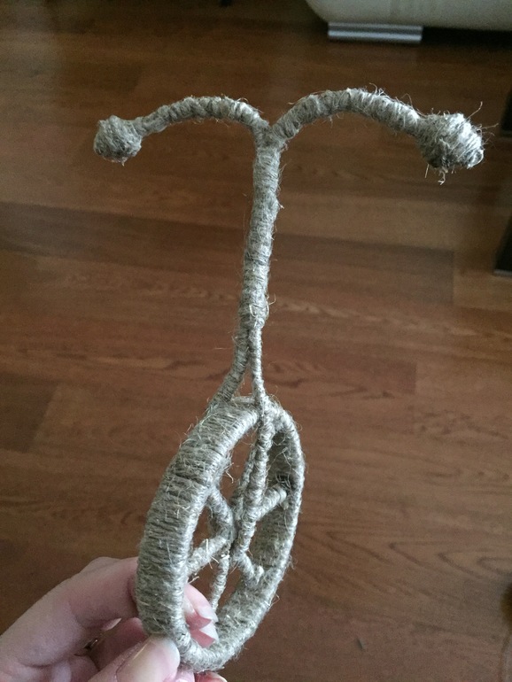 3. Берем проволоку обматываем ее нитками (не всю!) складываем пополам и продеваем через спицы переднего колеса-это наш будущий руль), дальше проволоку соединяем в одну и обматываем нитками опять же не до конца,дальше мы опять разъединяем проволоку на две,тем самым получаем ручки руля. На концах где сами ручки у велосипеда наматываем больше ниток,что бы выделить сами ручки)