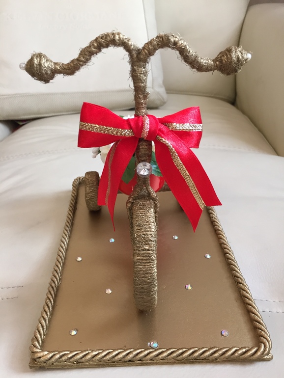 Приклеила готовый горшочек к задней оси велосипеда горячим пистолетом, привязала к рулю бант, наклеила стразину с понтом это фара). Велосипед на подставке так же зафиксировала (колеса) горячим пистолетом. Ну и шиканула немного наклеив на подставку немного настоящих страз Сваровски))))