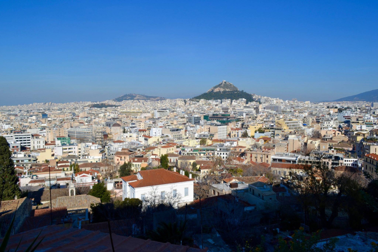 Виды с Анафиотики открываются необыкновенной красоты. Вдали по центру виднеется холм Ликавиттос, слева от него холм Стрефи, а справа -гора Гимет.
