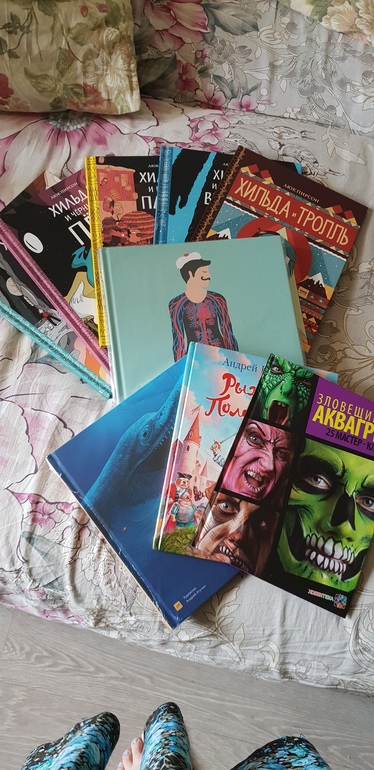 вот смотрю я на стопку и терзают смутные сомнения. Я уже дарила ему на прошлые д/р книги стопками, как итог, он их даже не все пролистал в тот день, да и потом как то вяло. Думаю Чудовищ отлажить до 1 сентября (подарить на 1 класс), возможно Белянина пока тоже, а вот что сделать с Хильдами, отдать все 5 сразу или например первые 2, а потом по мере прочтения подкидывать остальные ( при условии что 5 совершенно не законченная, а когда будет 6 большой вопрос)...