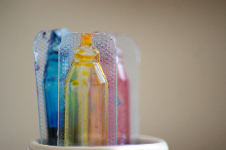 Ещё я когда то покупала красители в хобби-центре, для варки мыла. Тоже хорошо подходят. Для себя сделала вывод, что лучше всё таки использовать жидкий краситель, он экономичнее, ярче и окрашивает массу более однородно.