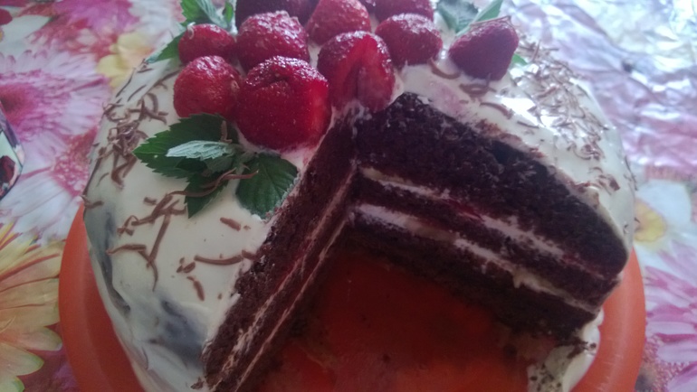 Все перемешать и добавить 1 ст. крутого кипятка. Чашу мультиварки смазать маслом, вылить тесто и поставить режим выпечка 1ч. и после ещё 30 минут.Получается один большой корж, дать остыть и разрезать на 3 - 4 коржа. Крем: