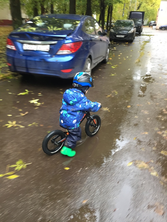 Где-то день привыкал к новым габаритам, беговел гораздо длиннее Пуки М. И немного потерял в маневренности и способности выписывать круги и восьмерки, с маленьким Пуки делать это было легче. Но с каждым днём все лучше и лучше уже. Зато скорость и мягкость на высоте!!! Плюс на нашем беговел покрышки Блек Джек с агрессивным протектором, которые держат любую дорогу. Катались с мокрого глиняного склона в дождь, беговел даже не пытается упасть.