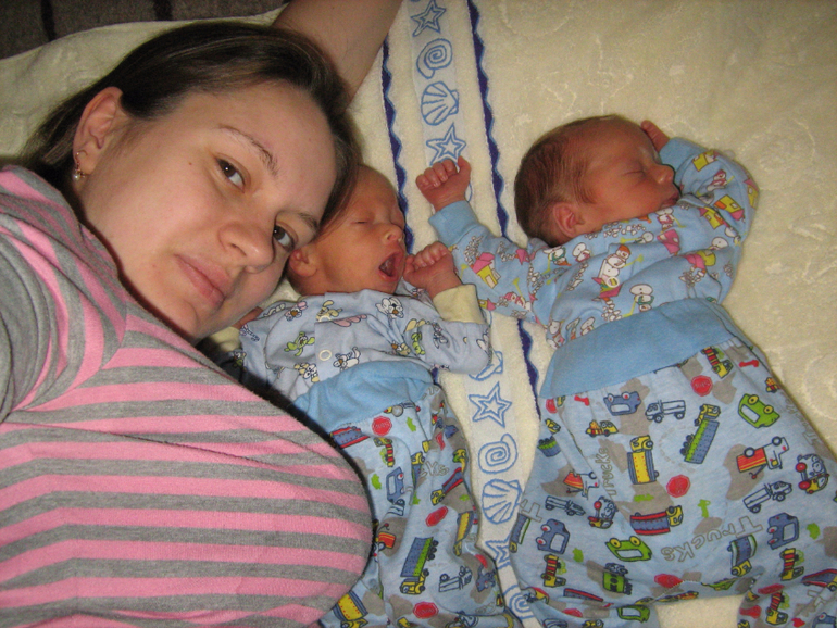 Я была под наркозом, так что мне было хорошо. Когда я очнулась надо мной были все те же мама и муж. Оказывается, что у меня была сильная потеря крови, была отслойка плаценты. Хирург созвал всех врачей чтобы мне помочь. Чтобы спасти детей. И вот мой крошкин, который зевает получил всего 1 бал по Апгар, из всех признаков жизни у него тихонечко билось сердечко. После роддома мы отправились в больницу рости и выхаживаться. Первого зайца отдали на первые сутки, второй самостоятельно задышал только на 10 сутки. Так что здесь на фото нам уже недельки 2 :)))