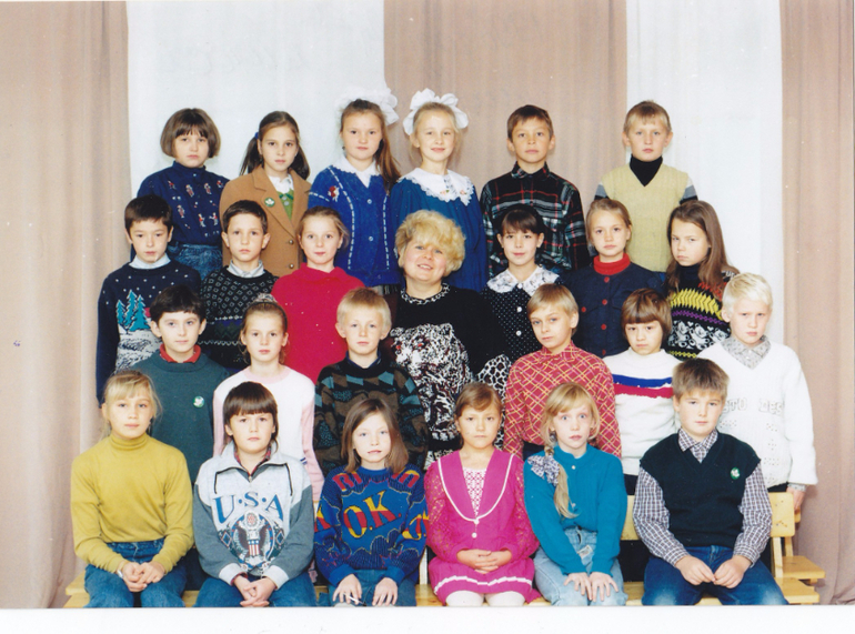 Со своим мужем я познакомилась в 3 классе :))) Вот как раз наше "первое" фото, муж мой в красной рубашке я стою почти рядом в джинсовом пиджачке и красном бадлоне :))))