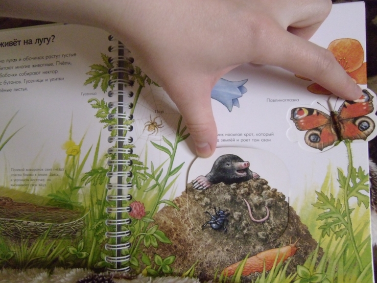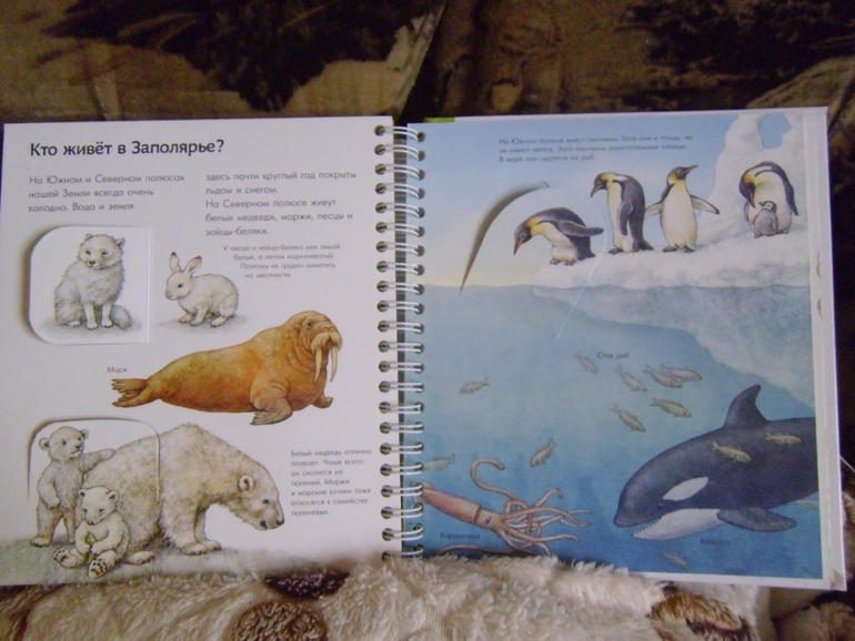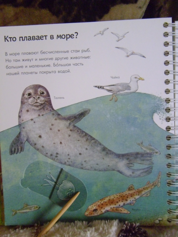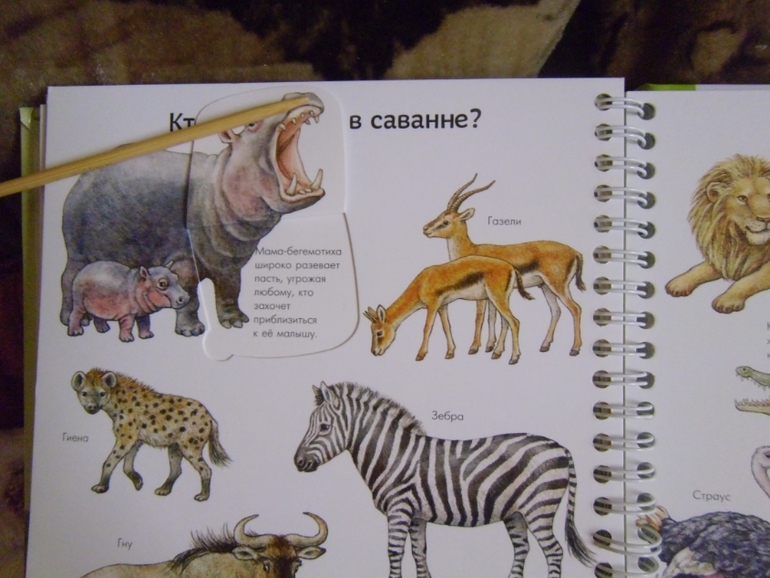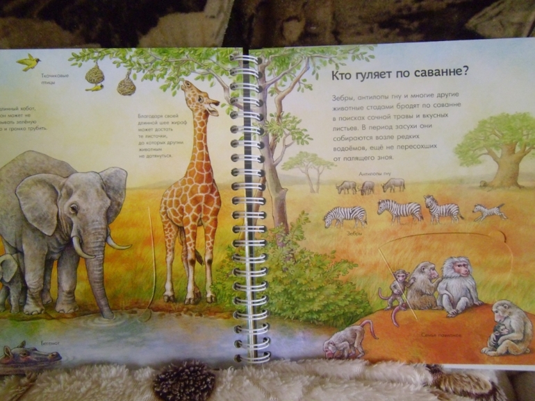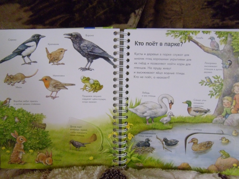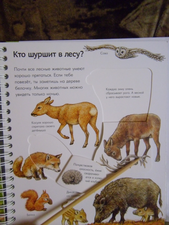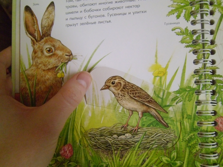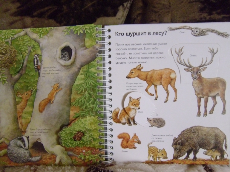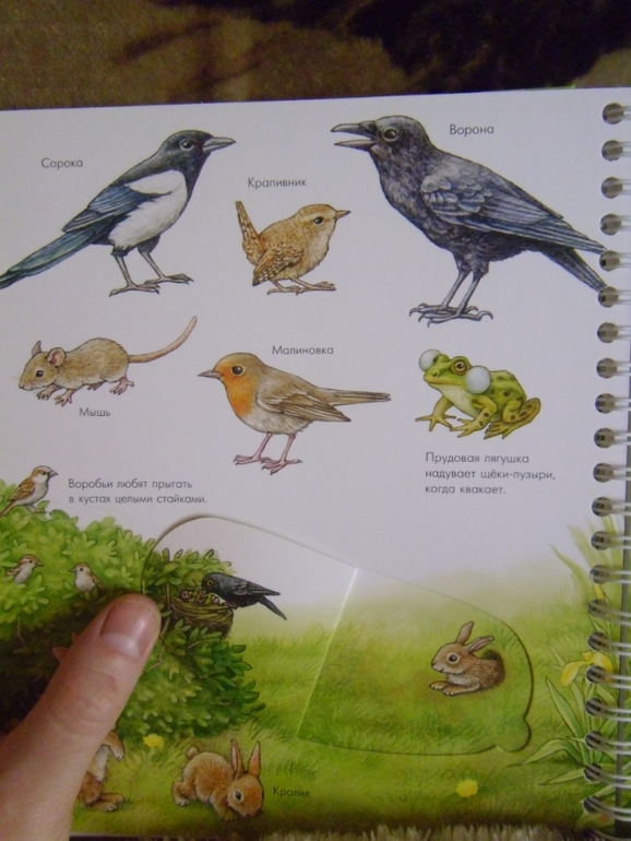 Когда думала купить или нет, отзывов адекватных не нашла.Поэтому достала с верхней полочки фотоаппарат, смахнула с него вековую пыль и отщелкала всю книгу.Она замечательная, толстенькая( целых 24 страницы, в остальных книгах серии -16),ладненькая, в руках держать приятно. Насчет указанного возраста у меня правда сомнения- для моей далеко не гениальной трехлетки открытием были только разноцветные ядовитые лягушки (восторг!!!)и то, что белка живет в гнезде(я тоже удивилась кстати).На мой взгляд, возраст от полутора до 3 лет. Для детей постарше слишком мало информации.