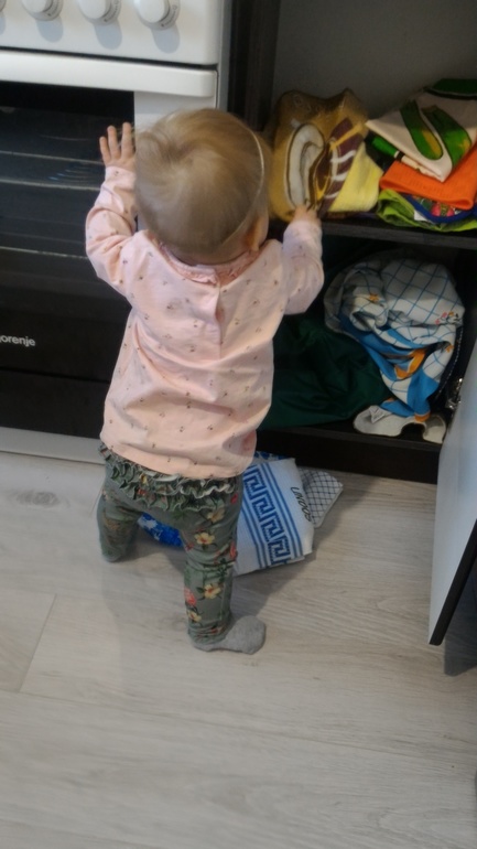 УМЕЛКИ:ползаем по всей квартире,убегает от меня ползком,я ее догоняю..она ржет ,довольная.Стоит с опорой на 1 руку,у стены,у шкафов ,уже уверенно стоит и открывает все ящики и все вытаскивает 😠Пытается отдирать обои в коридоре,1 кусок уже съела 😠глаз да глаз за ней!Хлопает в ладошки,машет привет,танцует под музыку))Из слов вроде нового ничего,все также :мама,папа,баба,дай,ненене и еще что-то непонятное.Начали знакомство с горшком,сначала ревела,когда сажала на него,сейчас посидит,если повезет,то пописает,1 раз даже покакала,но надо сажать чаще,я пока не могу,забываю)В четверг пойдем к педиатру,надо еще экг и анализы сдать,взвесить дома все время забываю😠Вот такие у нас дела))