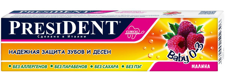 PRESIDENT Baby - это итальянский продукт, действующими веществами которого является глицерофосфат кальция и ксилитол. В пасте нет фторидов, лаурилсульфат натрия, парабенов, ПЭГ. Паста характерна легким малиновым ароматом, безопасна для проглатывания. В составе есть кальций глицерофосфат, защищающий зубную эмаль от повреждений.