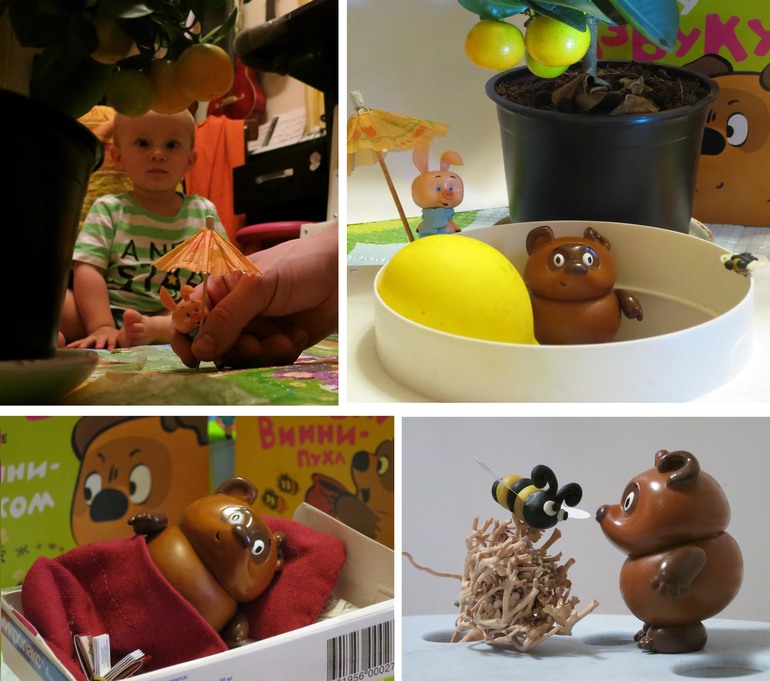 Данюшка (1 г 5 мес) фанатеет от Винни-Пуха. Постоянно просится посмотреть мультик (для этого берет Винни-Пуха в руки, бежит к компьютеру и лезет на кресло с решительным видом; когда папа (потворничая) усаживает его себе на колени перед экраном, тот тычет в папу пальцем с требованием надеть правильную футболку, т.е. футболку с Винни-пухом). Когда все элементы совпадают (футболка, игрушка, малодушничающий папа), они сидят смотрят мультик (а мама укоризненно смотрит на папу). Чтобы сократить время просмотра мультиков и создать мульто-игровой континуум, я привлекаю папу играть в Винни-Пуха.