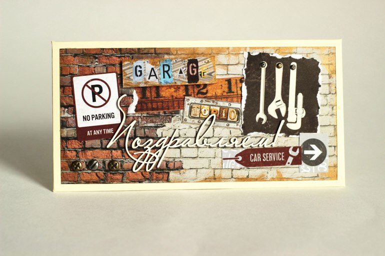 30 октября День Рождения у моего свёкра. Этот конверт для него. Он любит много времени проводить в гараже, там у него всё расставлено по полочкам и развешено по порядку=) Поэтому, даже на конверте инструменты в ряд))) С Днём Рождения, Александр Васильевич!