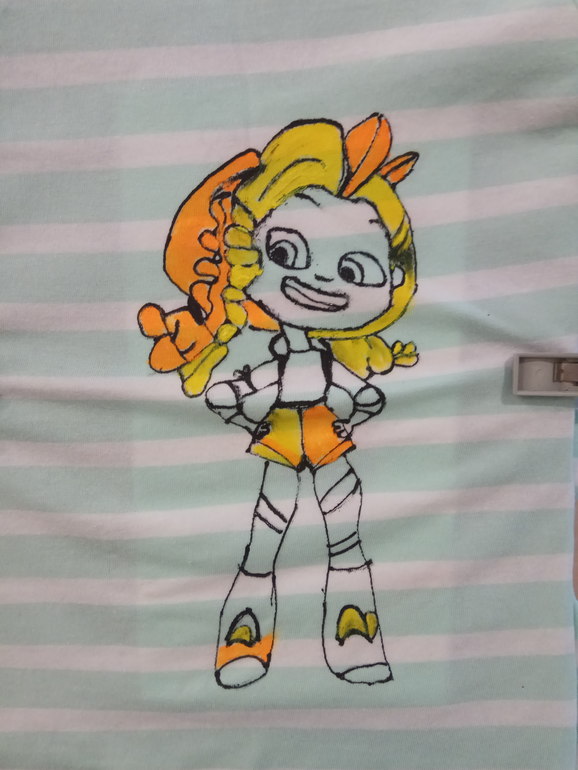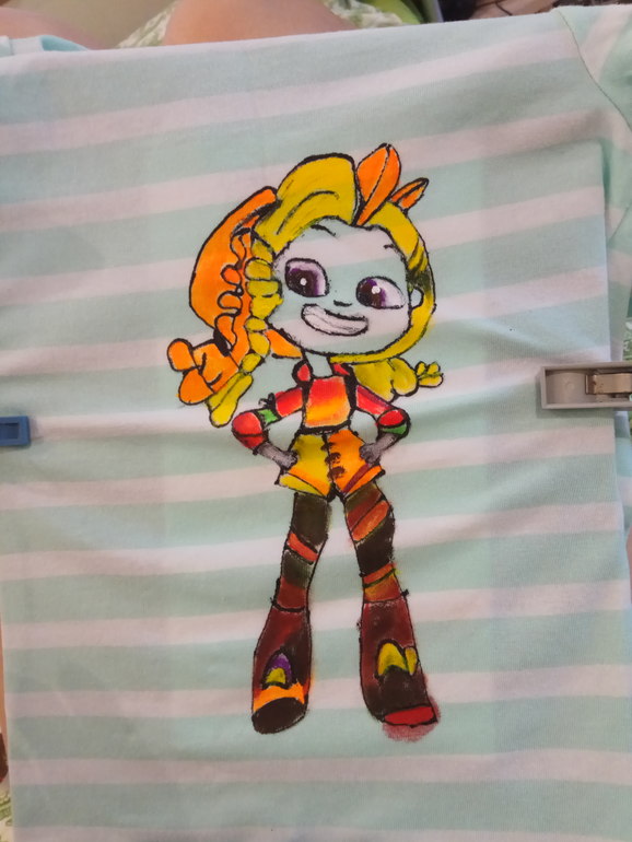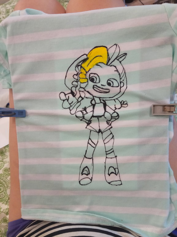 Всем привет. На практически новой майке ,дочка посадила пятна. Вот так я их закрасила. Но как оказалось кисточками очень сложно разрисовать не выходя за линии))) но ничего, главное практика. И главный вопрос у меня назрел. Как сделать бледно розовый цвет для раскраски лица. У меня нифига не вышел цвет,поэтому лицо не раскрашено