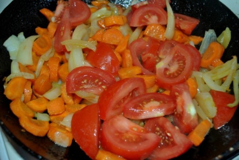 Нарезать морковку, лук, помидоры, болгарский перец, чеснок: